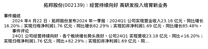 值得注意的是:2024年04月长江证券的于海宁/李烨/范超分析师,首次发布关于拓邦股份的研究报告,标题为:拓邦股份(002139):经营持续向好 高研发投入培育新业务。