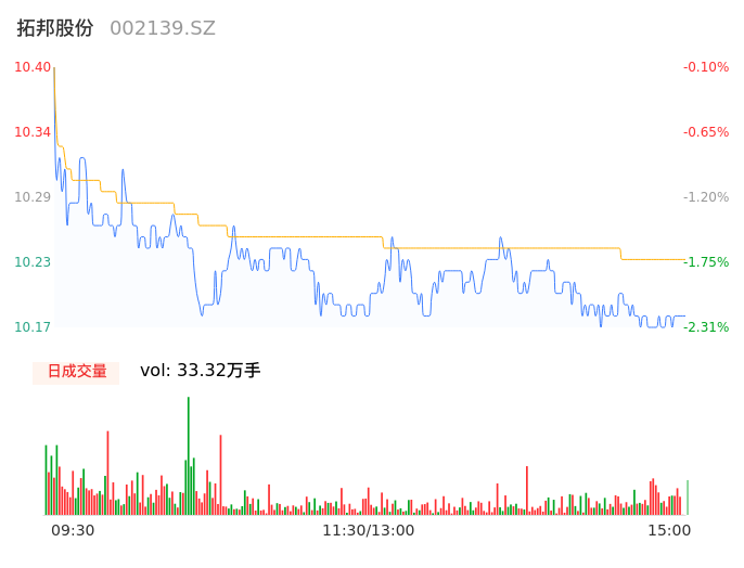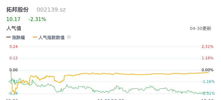 04月30日,拓邦股份收报10.17,股价涨幅-2.31%,成交金额3.41亿元,换手率3.11%。