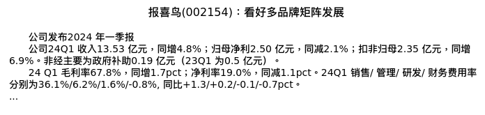 值得注意的是:2024年05月天风证券的孙海洋分析师,首次发布关于报喜鸟的研究报告,标题为:报喜鸟(002154):看好多品牌矩阵发展。