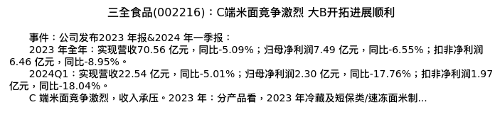 值得注意的是:2024年04月东吴证券的孙瑜/罗頔影分析师,首次发布关于三全食品的研究报告,标题为:三全食品(002216):C端米面竞争激烈 大B开拓进展顺利。