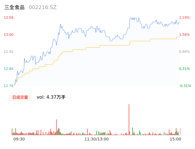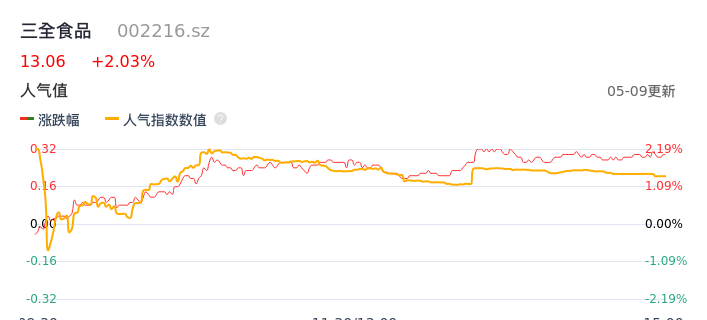05月09日,三全食品收报13.06,股价涨幅2.03%,成交金额5672.57万元,换手率0.69%。