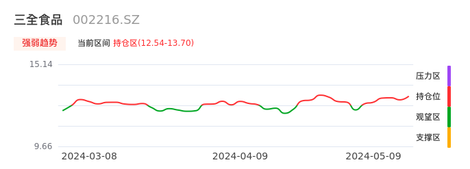 我们来看一下该股的九方特色指标强弱趋势的情况:三全食品自04月29日从观望区上穿到持仓区。股价近期在多头区域持续强势上扬,上升动能仍较为充足,可积极关注。后续重点关注上方压力位:13.70元是否能突破上攻。
