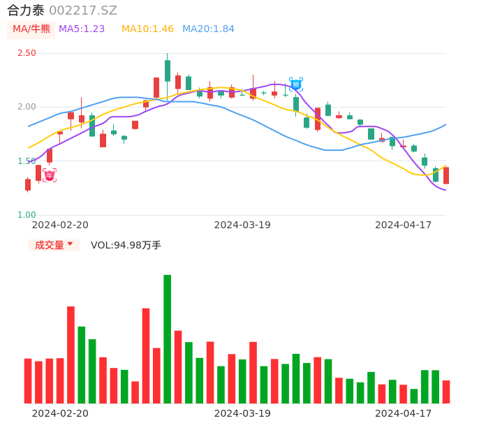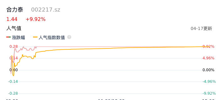 04月17日,合力泰收报1.44,股价涨幅9.92%,成交金额1.34亿元,换手率3.05%。