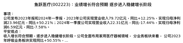 值得注意的是:2024年05月平安证券的叶寅/倪亦道/裴晓鹏分析师,首次发布关于鱼跃医疗的研究报告,标题为:鱼跃医疗(002223):业绩增长符合预期 逐步进入稳健增长阶段。