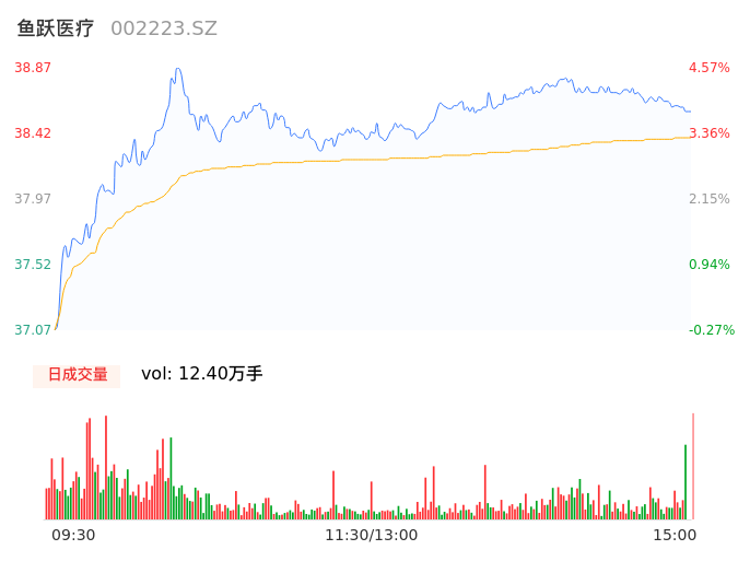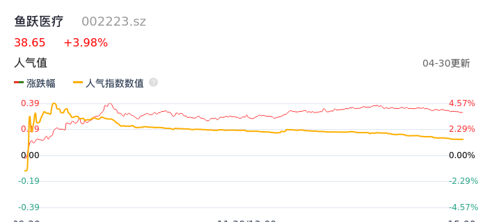 04月30日,鱼跃医疗收报38.65,股价涨幅3.98%,成交金额4.76亿元,换手率1.32%。