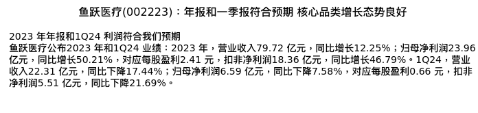 值得注意的是:2024年04月中金公司的朱言音/全芳/张琎分析师,首次发布关于鱼跃医疗的研究报告,标题为:鱼跃医疗(002223):年报和一季报符合预期 核心品类增长态势良好。