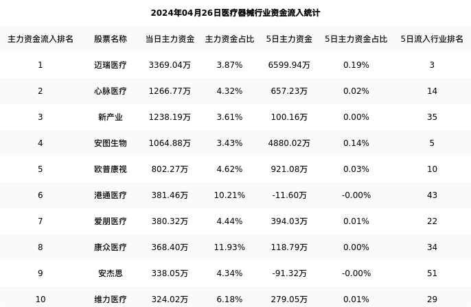 从主力资金流向来看,医疗器械行业今日主力资金流入28.42亿元,在所有申万二级行业中排名:5/131。
