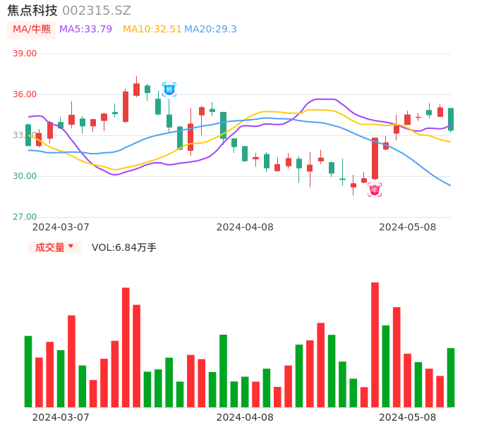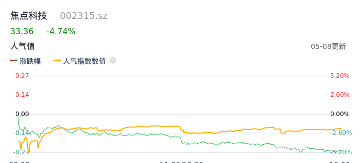 05月08日,焦点科技收报33.36,股价涨幅-4.74%,成交金额2.31亿元,换手率3.39%。
