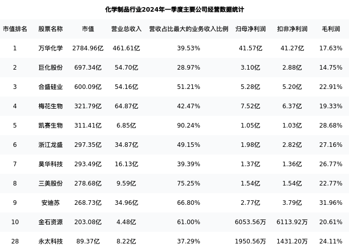 永太科技最新报告期数据为一季度,下表汇总了化学制品行业内市值靠前的公司一季度主要经营数据