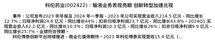 值得注意的是:2024年04月西南证券的杜向阳分析师,首次发布关于科伦药业的研究报告,标题为:科伦药业(002422):输液业务表现亮眼 创新转型加速兑现。