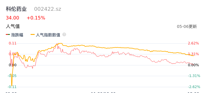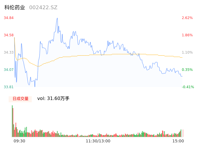 05月06日,科伦药业收报34.00,股价涨幅0.15%,成交金额10.82亿元,换手率2.42%。
