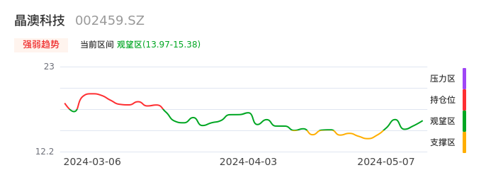 我们来看一下该股的九方特色指标强弱趋势的情况:晶澳科技自04月26日从支撑区回到观望区。股价前期快速下跌后经过中途弱势整理。目前短期处于弱势反弹迹象,后续重点关注能否站上多空分界点:15.38元。如未能有效突破则说明弱势反弹行情结束。后续可能再次进入空头行情。