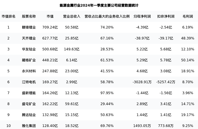 天齐锂业最新报告期数据为一季度,下表汇总了能源金属行业内市值靠前的公司一季度主要经营数据