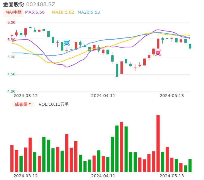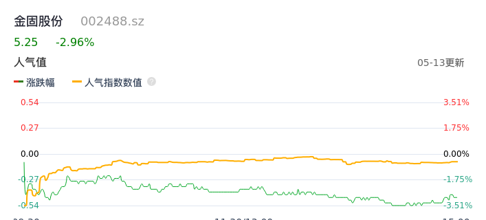 05月13日,金固股份收报5.25,股价涨幅-2.96%,成交金额5331.70万元,换手率1.10%。