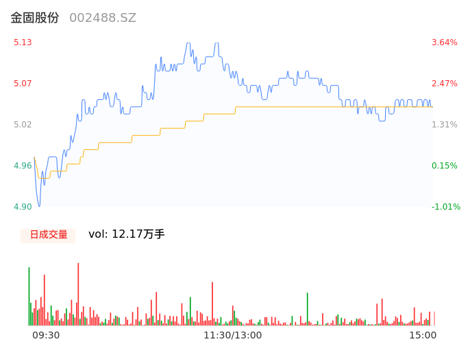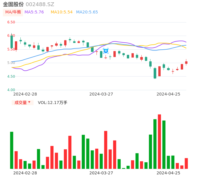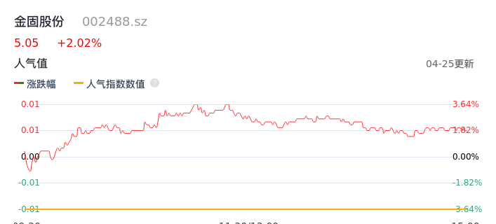 04月25日,金固股份收报5.05,股价涨幅2.02%,成交金额6134.80万元,换手率1.33%。
