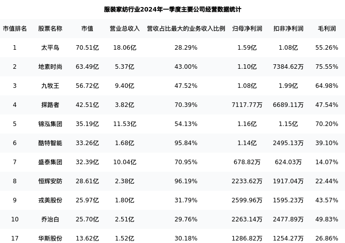 华斯股份最新报告期数据为一季度,下表汇总了服装家纺行业内市值靠前的公司一季度主要经营数据