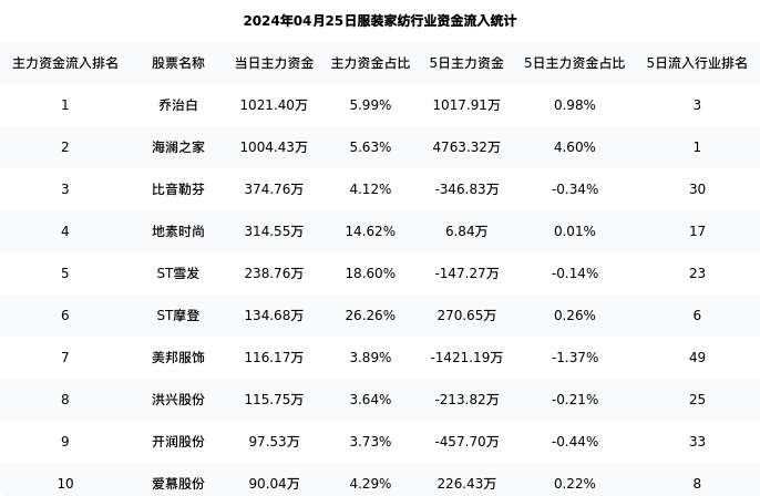 从主力资金流向来看,服装家纺行业今日主力资金流入4.36亿元,在所有申万二级行业中排名:103/131。