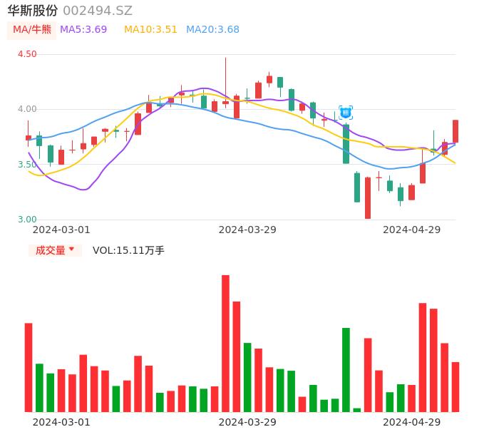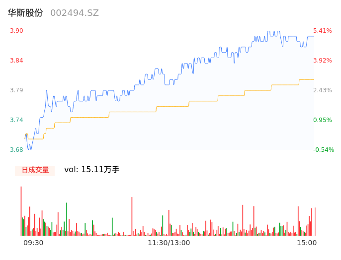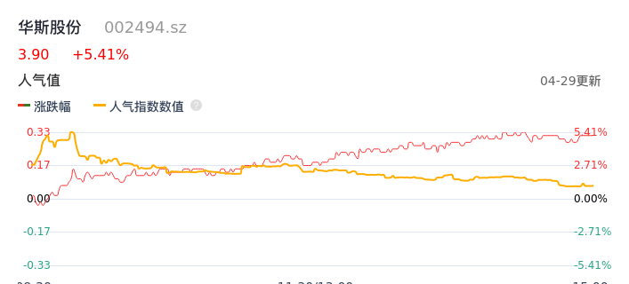 04月29日,华斯股份收报3.90,股价涨幅5.41%,成交金额5758.59万元,换手率5.27%。