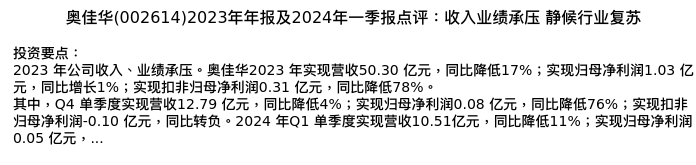 值得注意的是:2024年04月上海申银万国证券研究所的刘正/刘嘉玲分析师,首次发布关于奥佳华的研究报告,标题为:奥佳华(002614)2023年年报及2024年一季报点评:收入业绩承压 静候行业复苏。