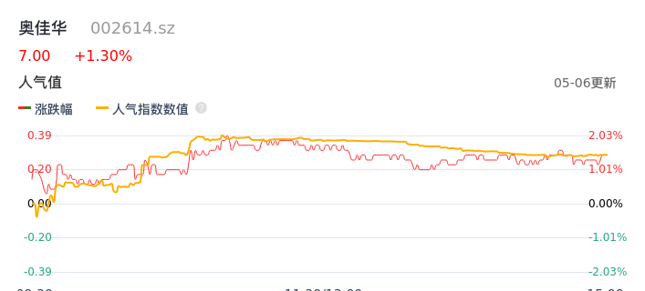 05月06日,奥佳华收报7.00,股价涨幅1.30%,成交金额8810.38万元,换手率2.85%。