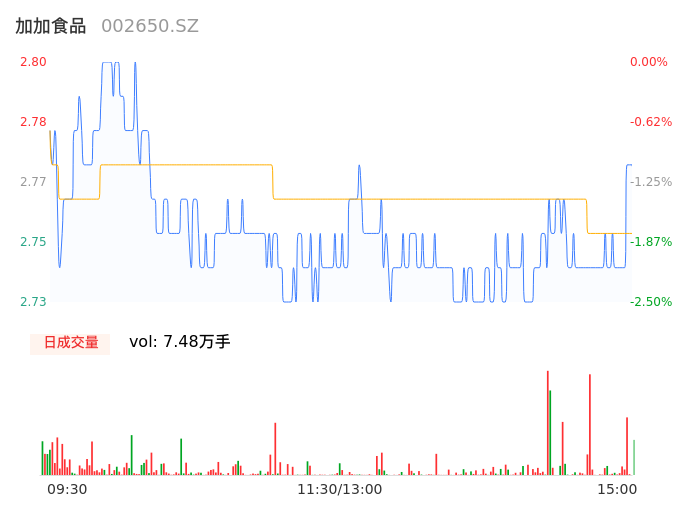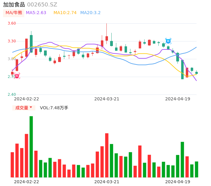 04月19日,加加食品收报2.75,股价涨幅-1.79%,成交金额2060.04万元,换手率0.65%。