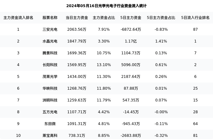 从主力资金流向来看,光学光电子行业今日主力资金流入26.93亿元,在所有申万二级行业中排名:1/131。