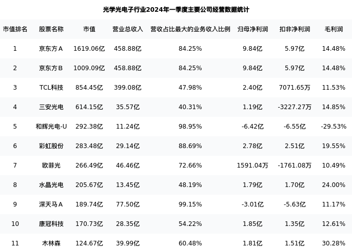 木林森最新报告期数据为一季度,下表汇总了光学光电子行业内市值靠前的公司一季度主要经营数据