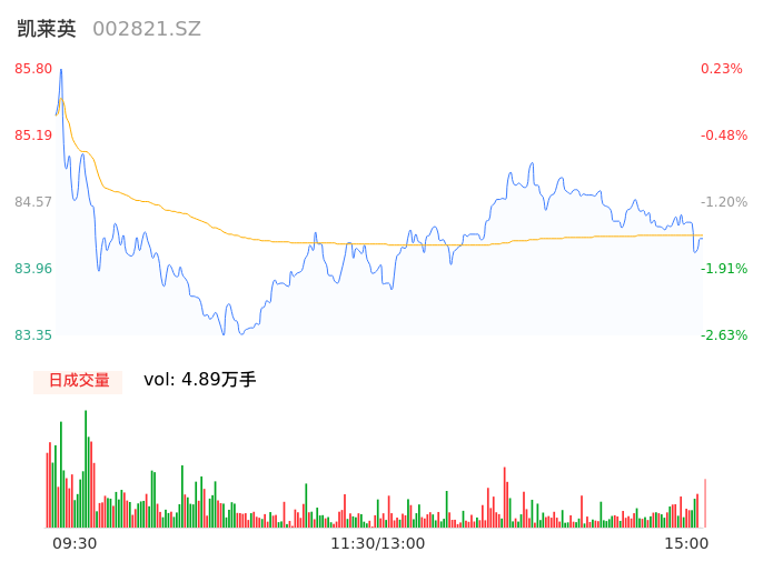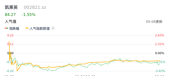 05月08日,凯莱英收报84.27,股价涨幅-1.55%,成交金额4.12亿元,换手率1.49%。