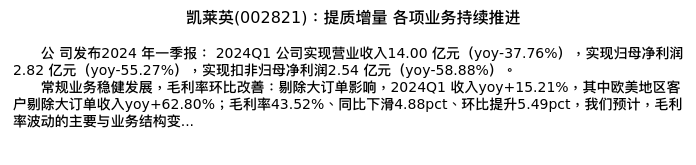 值得注意的是:2024年05月招商证券的许菲菲/梁广楷分析师,首次发布关于凯莱英的研究报告,标题为:凯莱英(002821):提质增量 各项业务持续推进。