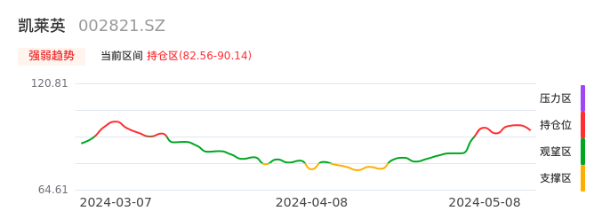 我们来看一下该股的九方特色指标强弱趋势的情况:凯莱英自04月29日从观望区上穿到持仓区。股价近期在多头区域回调整理。后续重点关注多空分界点的争夺:82.56元。如未能有效站稳则可能重新回到空头行情。