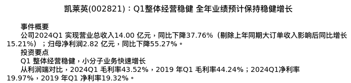值得注意的是:2024年05月天风证券的杨松/贺晓晗分析师,首次发布关于凯莱英的研究报告,标题为:凯莱英(002821):Q1整体经营稳健 全年业绩预计保持稳健增长。
