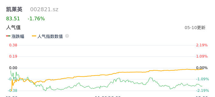 05月10日,凯莱英收报83.51,股价涨幅-1.76%,成交金额3.12亿元,换手率1.13%。