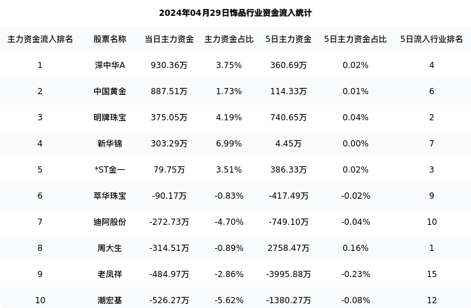 从主力资金流向来看,饰品行业今日主力资金流入5.33亿元,在所有申万二级行业中排名:113/131。