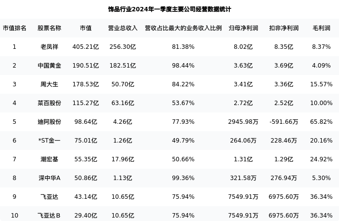 周大生最新报告期数据为一季度,下表汇总了饰品行业内市值靠前的公司一季度主要经营数据