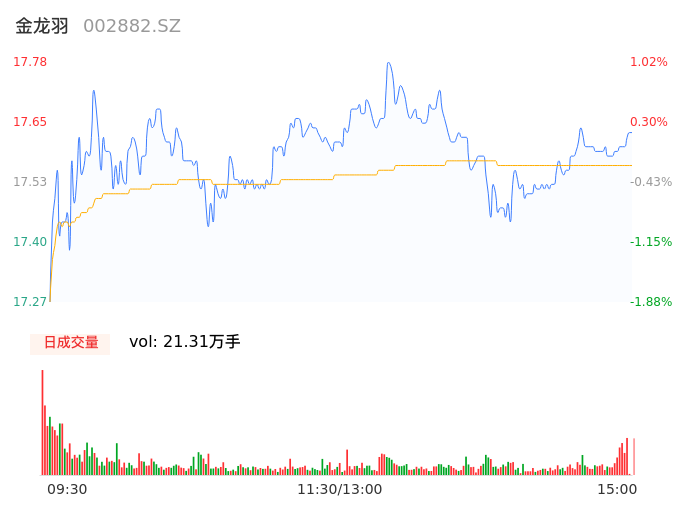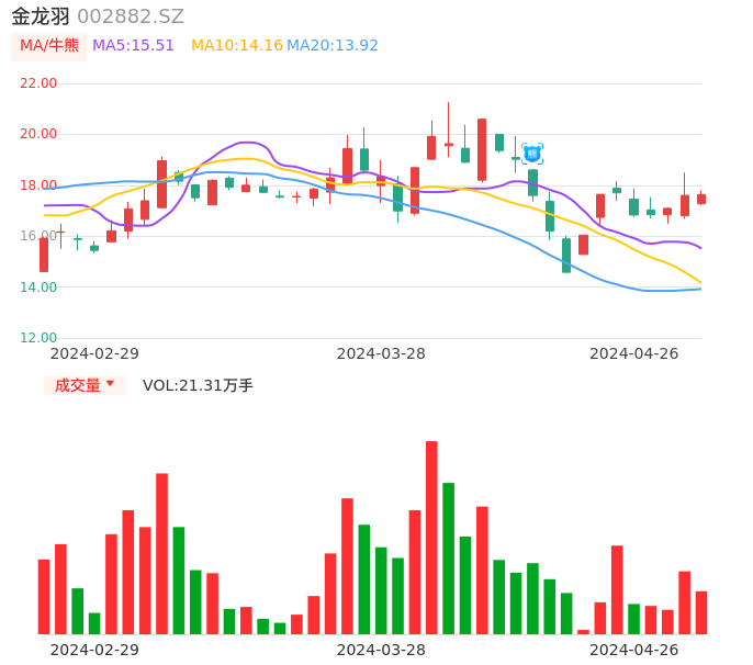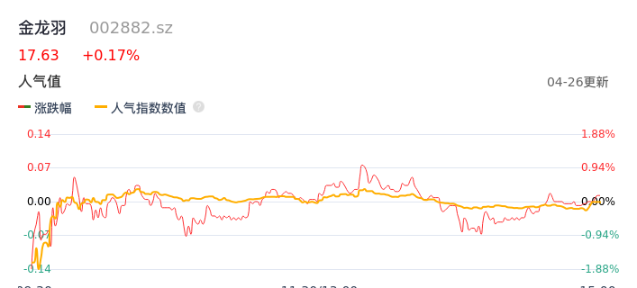 04月26日,金龙羽收报17.63,股价涨幅0.17%,成交金额3.74亿元,换手率8.64%。