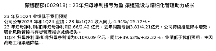 值得注意的是:2024年05月中金公司的徐卓楠/柳政甫分析师,首次发布关于蒙娜丽莎的研究报告,标题为:蒙娜丽莎(002918):23年归母净利扭亏为盈 渠道建设与精细化管理助力成长。