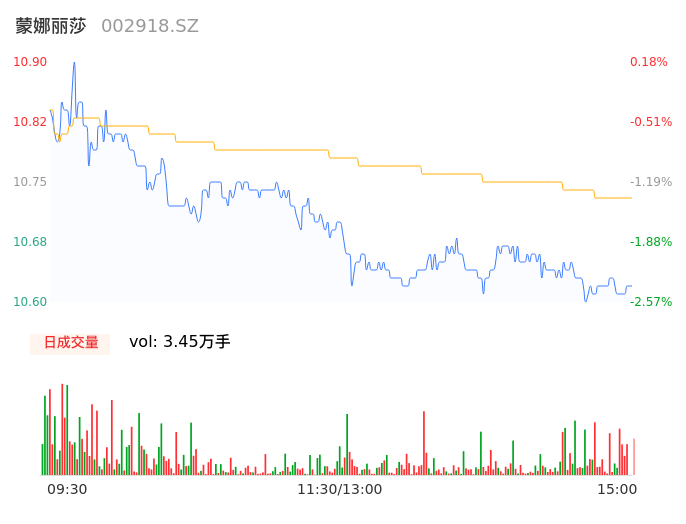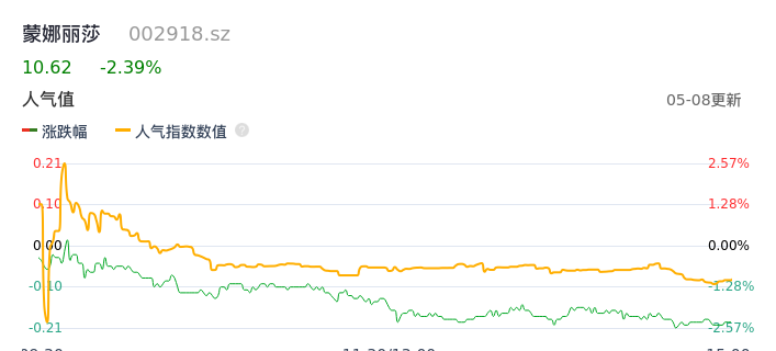 05月08日,蒙娜丽莎收报10.62,股价涨幅-2.39%,成交金额3700.01万元,换手率1.57%。