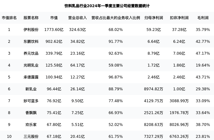 新乳业最新报告期数据为一季度,下表汇总了饮料乳品行业内市值靠前的公司一季度主要经营数据