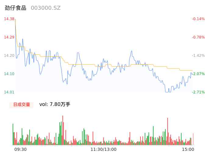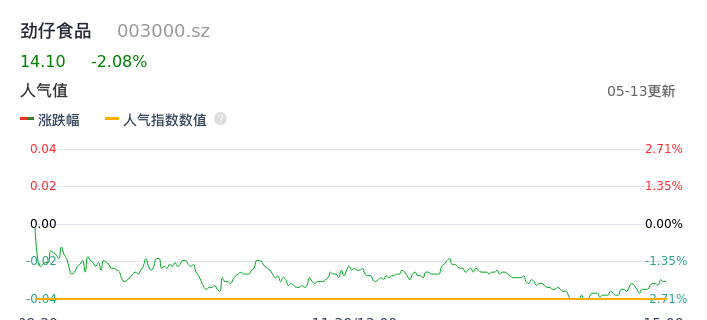 05月13日,劲仔食品收报14.10,股价涨幅-2.08%,成交金额1.10亿元,换手率2.58%。
