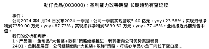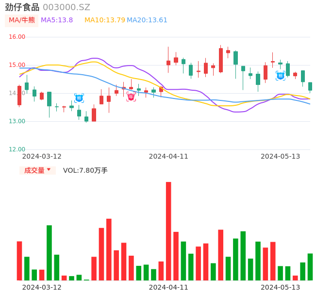 值得注意的是:2024年05月天风证券的陈潇分析师,首次发布关于劲仔食品的研究报告,标题为:劲仔食品(003000):盈利能力改善明显 长期趋势有望延续。