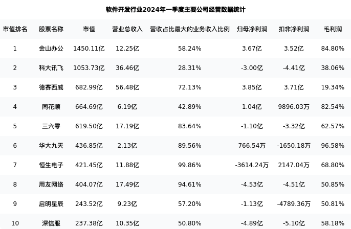 同花顺最新报告期数据为一季度,下表汇总了软件开发行业内市值靠前的公司一季度主要经营数据
