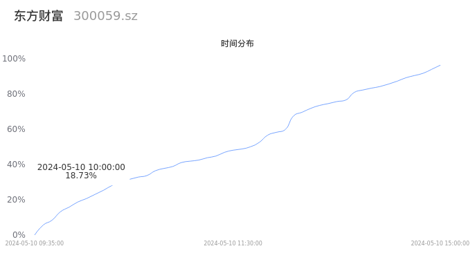 300059东方财富2024年05月10日成交159.36万手,成交金额20.86亿元,相较昨日放量18.54万手,换手率1.19%,成交清淡。