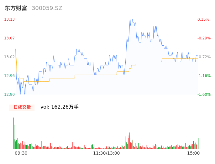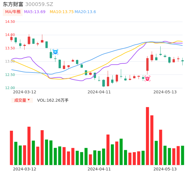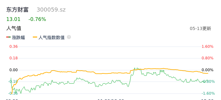 05月13日,东方财富收报13.01,股价涨幅-0.76%,成交金额21.10亿元,换手率1.21%。