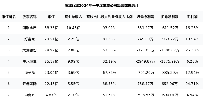 国联水产最新报告期数据为一季度,下表汇总了渔业行业内市值靠前的公司一季度主要经营数据