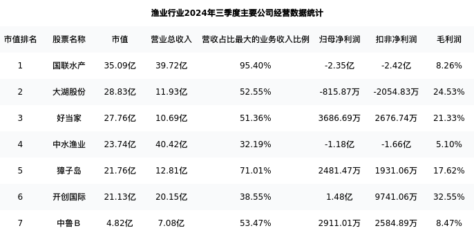 国联水产最新报告期数据为三季度,下表汇总了渔业行业内市值靠前的公司三季度主要经营数据