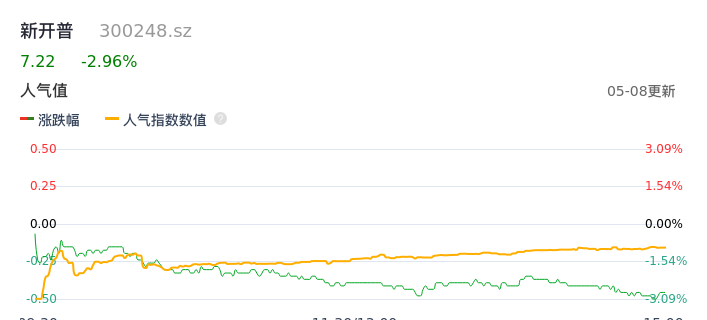 05月08日,新开普收报7.22,股价涨幅-2.96%,成交金额3024.87万元,换手率1.02%。