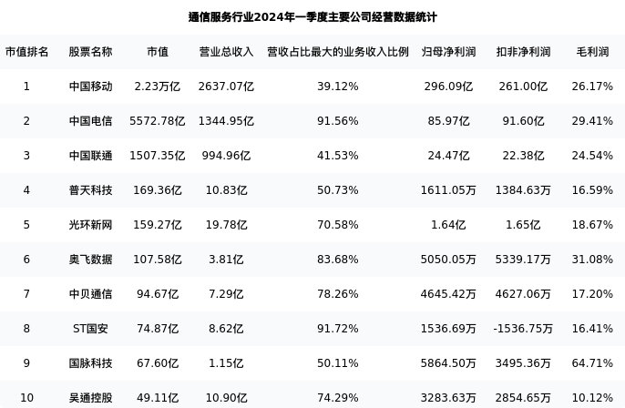 光环新网最新报告期数据为一季度,下表汇总了通信服务行业内市值靠前的公司一季度主要经营数据