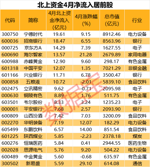 个股方面,根据披露的北上资金持股数量变化与个股当日成交均价计算,4月北上资金净流入超1亿元的个股共有178只,其中宁德时代招商银行京东方A等8股获得北上资金净流入超10亿元。