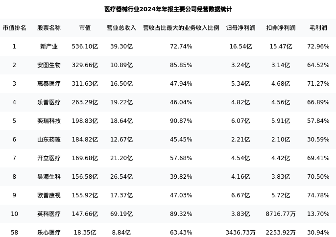 乐心医疗最新报告期数据为年报,下表汇总了医疗器械行业内市值靠前的公司年报主要经营数据