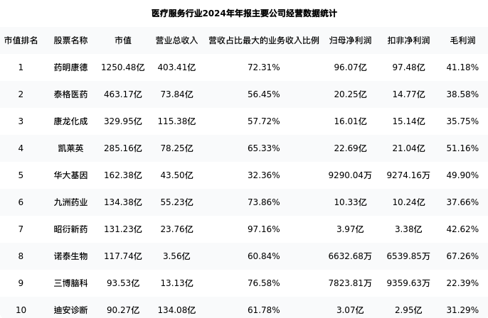华大基因最新报告期数据为年报,下表汇总了医疗服务行业内市值靠前的公司年报主要经营数据